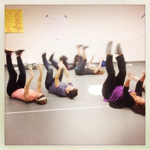 The workshop opened with a series of warm-ups, kinesthetically and linguistically oriented. The group created a list of vocabulary words that reminded them of dance: move, jump, twist, breath, etc. The participants were asked to free write for a few minutes, focusing on their first experiences with language and movement.