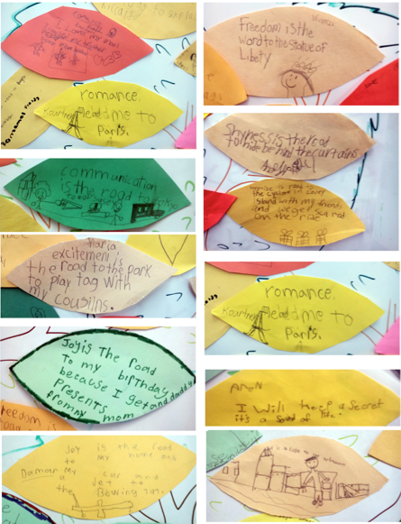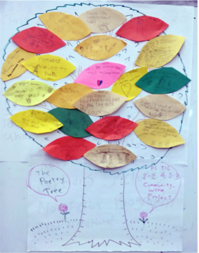 1st grade teaching artist visual arts writing Dulcimer poetry 2nd grade cwpnyc teacher students NY Community Trust elementary school poetry tree ps 316The first and second grade students at PS 316 worked on uncovering the many themes in the works we’ve been learning such as generosity, community, elegance, wonder, love, humor, nature. They made long lists of these Ideas & Feelings which they used in learning how to write metaphors using their senses. i.e. Music is the road to a family party with dancing...” The students used the metaphors they created to make a “Poetry Tree".