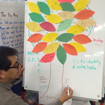 1st grade teaching artist visual arts writing Dulcimer poetry 2nd grade cwpnyc teacher students NY Community Trust elementary school poetry tree ps 316The first and second grade students at PS 316 worked on uncovering the many themes in the works we’ve been learning such as generosity, community, elegance, wonder, love, humor, nature. They made long lists of these Ideas & Feelings which they used in learning how to write metaphors using their senses. i.e. Music is the road to a family party with dancing...” The students used the metaphors they created to make a “Poetry Tree".
