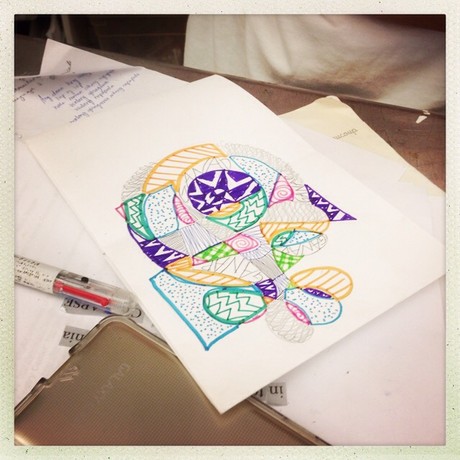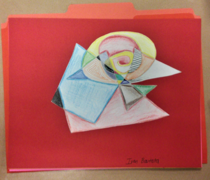 The students were prompted to sketch overlapping circles, squares, etc. on paper without lifting their pen. Then, they chose their favorite flow sketch, counting shapes created by the intersecting lines, adding contrasting color and pattern to each shape created by the intersecting lines with marker and colored pencil. Students were prompted not to place the same color next to each other, and to start to associate color with emotions and moods. Through this exercise, students were introduced to the schools of abstract art, expressionism, and surrealism as well as their own creative processes.