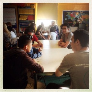 On Wednesday, June 24th, Community-Word Project Teachers and Staff embarked on a brand new journey with corporate volunteers from BlackRock’s Latin America & Iberia Division by creating what was later named Mentor Day. At 8 o’clock in the morning, six CWP staffers and 20 BlackRock volunteers assembled at Accion Academy with an idea to create a kind of career day in which the volunteers would share and teach the classes of 7th & 8th grade students about their lives, and what it means to use creativity in the workforce. The weeks building up to this event revolved around numerous emails, phone calls and meetings that focused on educating the students about BlackRock and finding a way to show them how the poetic and theatrical devices they had been working on with their CWP Teaching Artists could be incorporated into the workplace later in life. Presentations were built. Roles assigned. T-shirts made. Student questions prepped. Community writing lessons created. And a plethora of other small details necessary to execute an event like this were implemented.