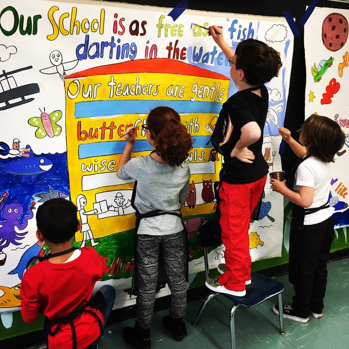 Painting Mural Williamsburg Brooklyn elementary school Visual Arts teaching Artists HBO Muralist PS 84 Poetry Linklaters 3rd graders CWPNYC